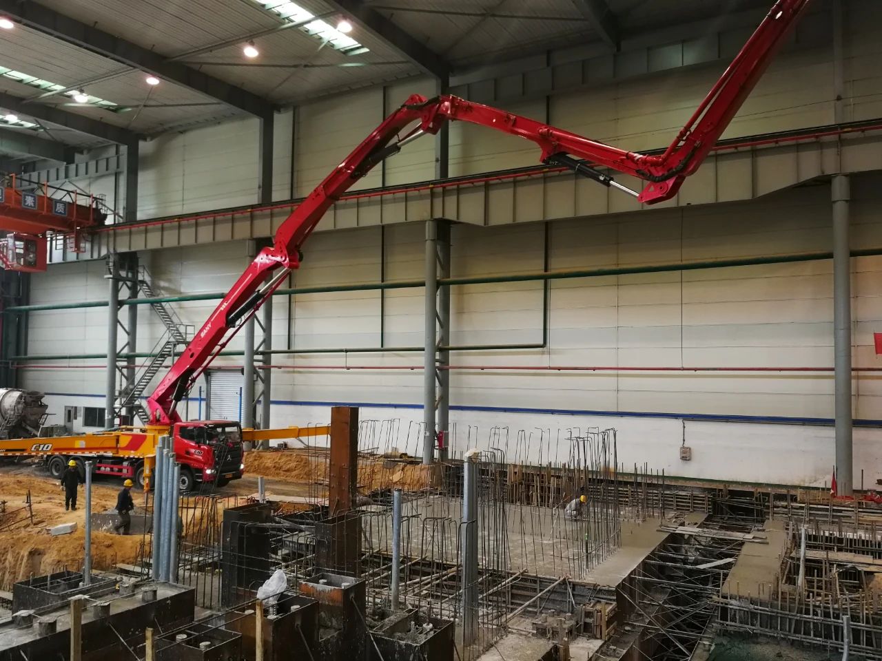此次軋機基礎(chǔ)澆筑施工連續(xù)澆筑混凝土56小時,澆筑混凝土體積多達3200立方米,主要澆筑位置為軋機電機平臺、開卷機、卷取機、檢查站、四個運輸巷道等,是目前該項目土建工程中難度最大、技術(shù)質(zhì)量要求最高的一次混凝土澆筑施工。