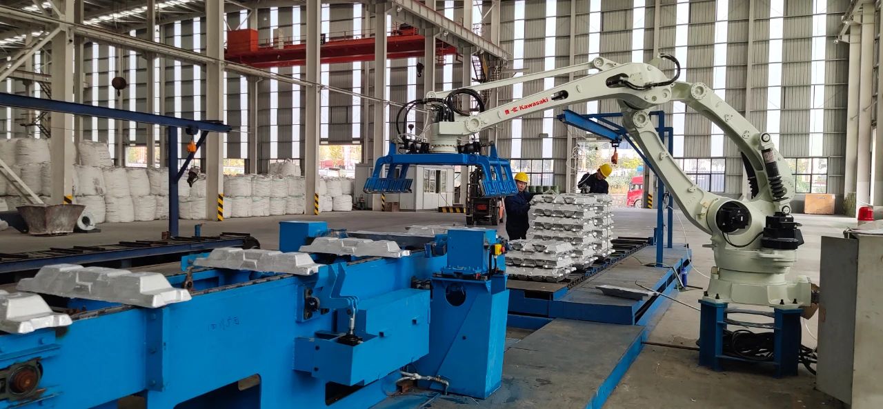 經過考察和反復研討,廣元中孚項目部確定了升級改造方案,科學進行生產調度。設備到場后,技術骨干全力配合廠家進行改造,僅用一周時間就完成了1號鑄錠線的改造工作。目前,1號鑄錠線鏈式輸送機、冷運機運行平穩,嶄新的機械手取代了原來的液壓碼垛機,有條不紊地抓放著銀白色的鋁錠。