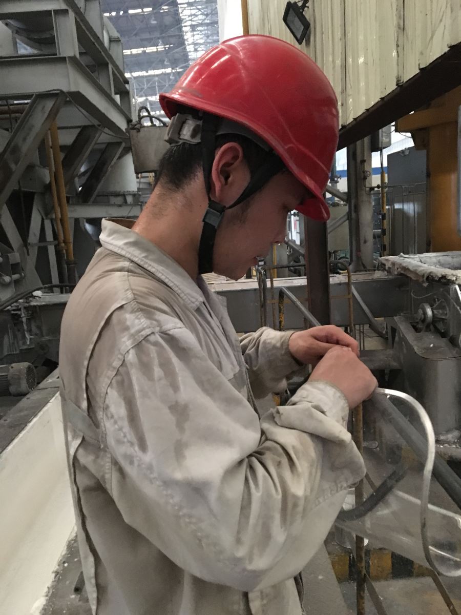 電解車間氣溫較高,檢測中心取樣班員工在電解槽旁,不顧高溫,認真細致地進行取樣工作,舀取鋁水,冷卻、編號,取制樣品平整、編號清晰、無飛邊,確保了分析樣品的及時傳遞與數據分析。