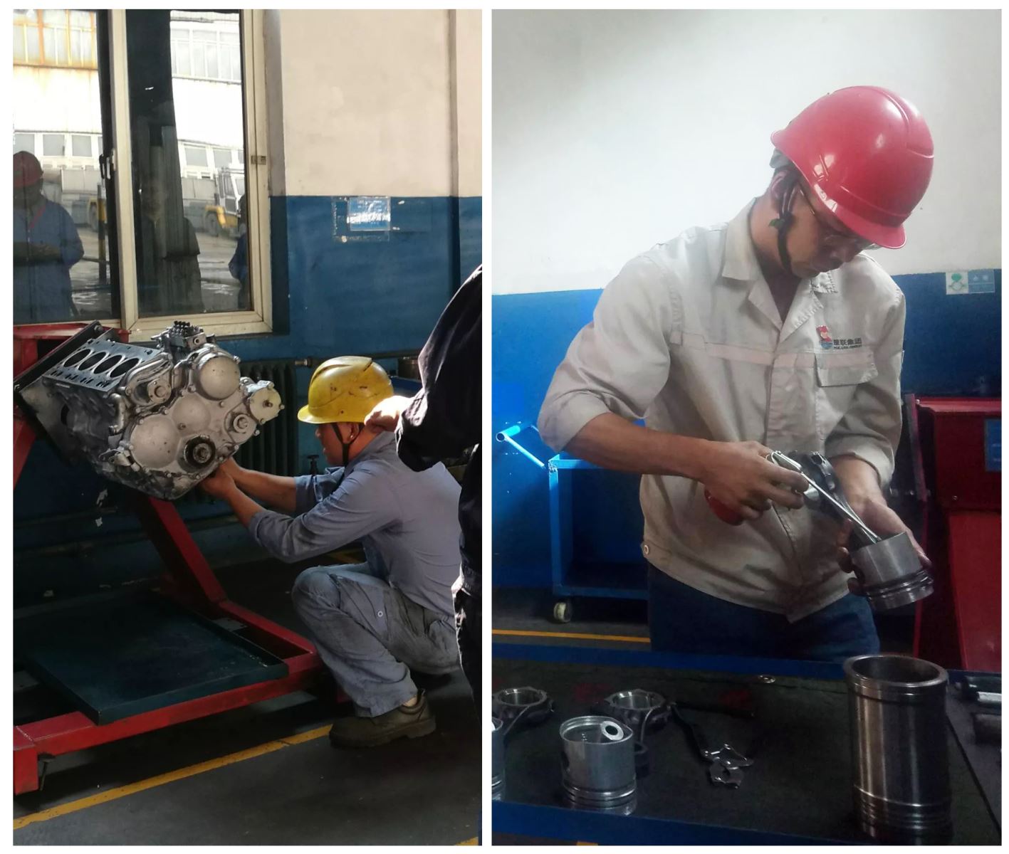 參賽選手沉著冷靜、專心專注,按照發動機組裝工藝嫻熟地操作著,順利地將活塞連桿組安裝完畢,展現出精湛的操作技能。裁判現場打分。